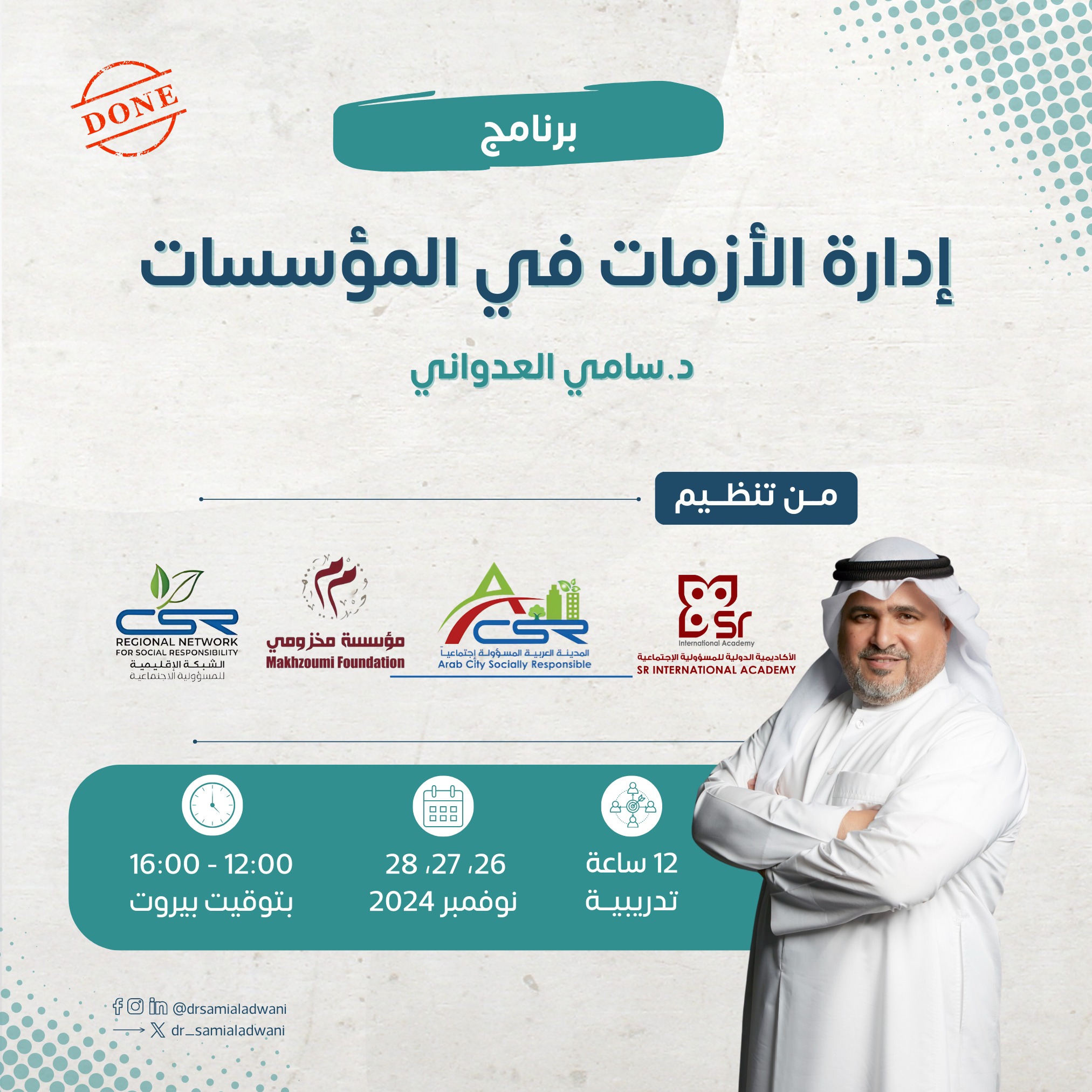 في برنامج تدريبي من 12 ساعة تشرفت بإكساب المشاركين المعارف والمهارات الأساسية اللازمة عن “إدارة الأزمات في المؤسسات”، من أجل تنمية قدرتهم في علاج الأزمات وتغيير بوادرها قبل حدوثها، وتوضيح اتجاهات المسارات المختلفة أمام صانعي القرار في المؤسسات، على مدار ثلاثة أيام 26 – 27 – 28 نوفمبر 2024.
