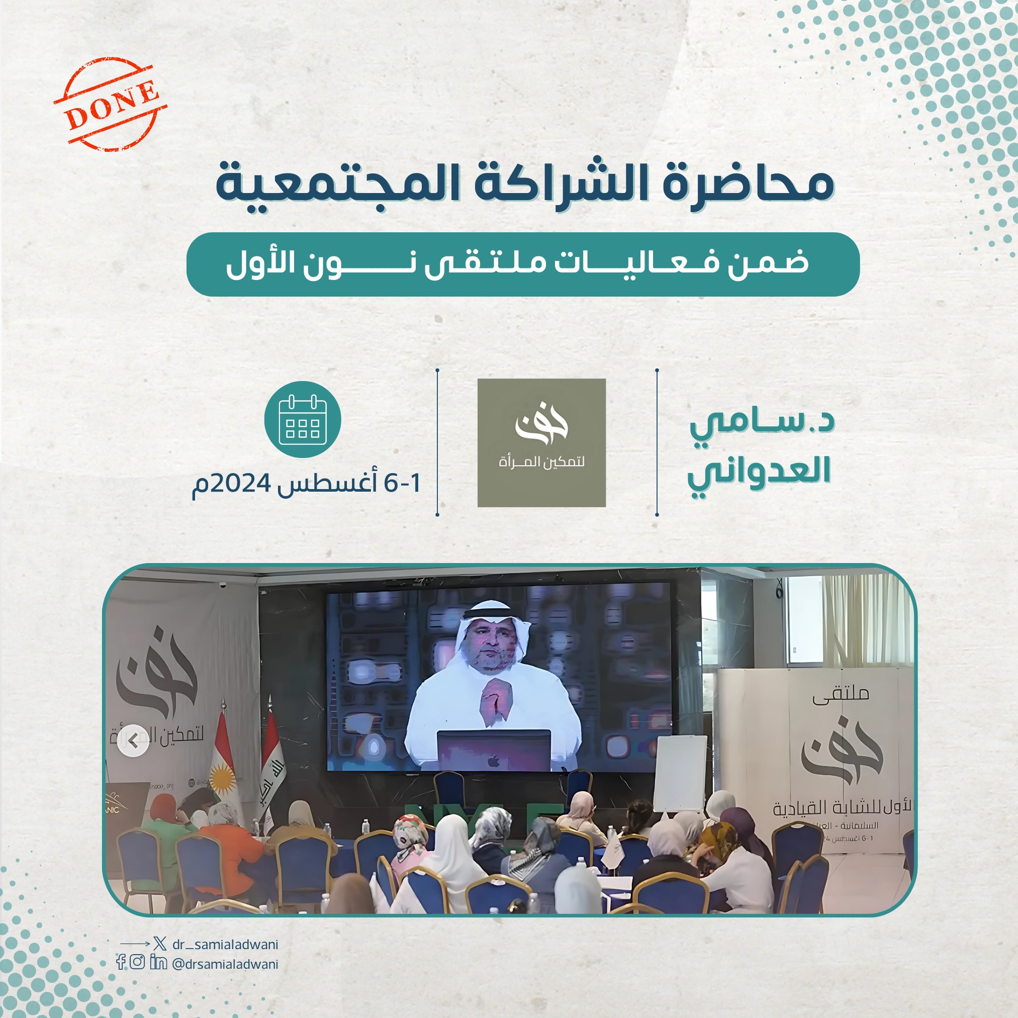 تشرفت بتقديم محاضرة في الشراكة المجتمعية ضمن فعاليات ملتقى نون الأول بالعراق، من تنظيم مؤسسة نون لتمكين المرأة من أداء دورها والارتقاء بوعيها وواقعها لتحقيق الإصلاح والتنمية في المجتمع.