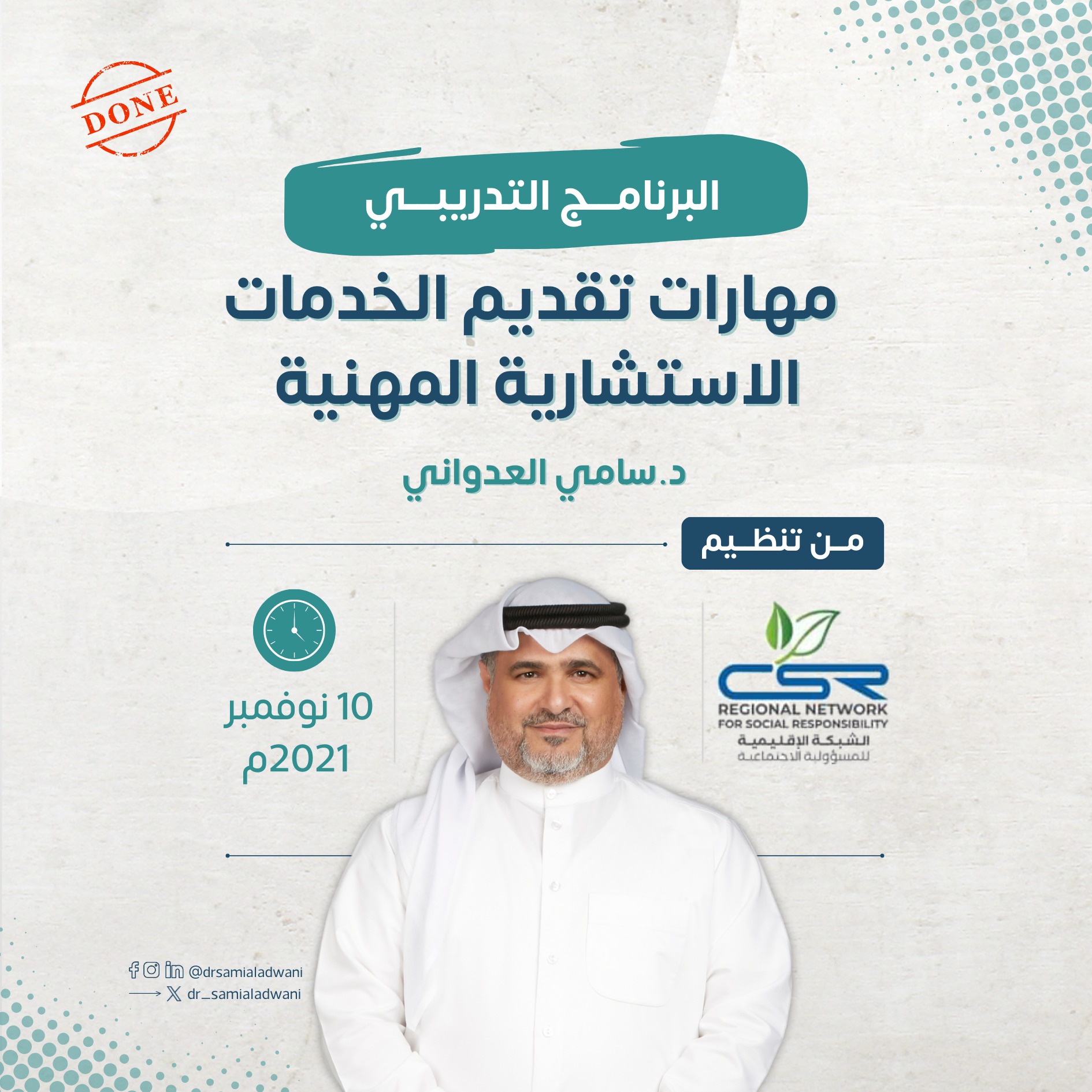 ضمن مبادرة الشبكة الإقليمية للمسؤولية الاجتماعية تشرفت بتقديم برنامج تدريبي في مهارات تقديم الخدمات الاستشارية المهنية يوم 10 نوفمبر 2021م عن العملية الاستشارية ومعاييرها ومقوماتها الأساسية.