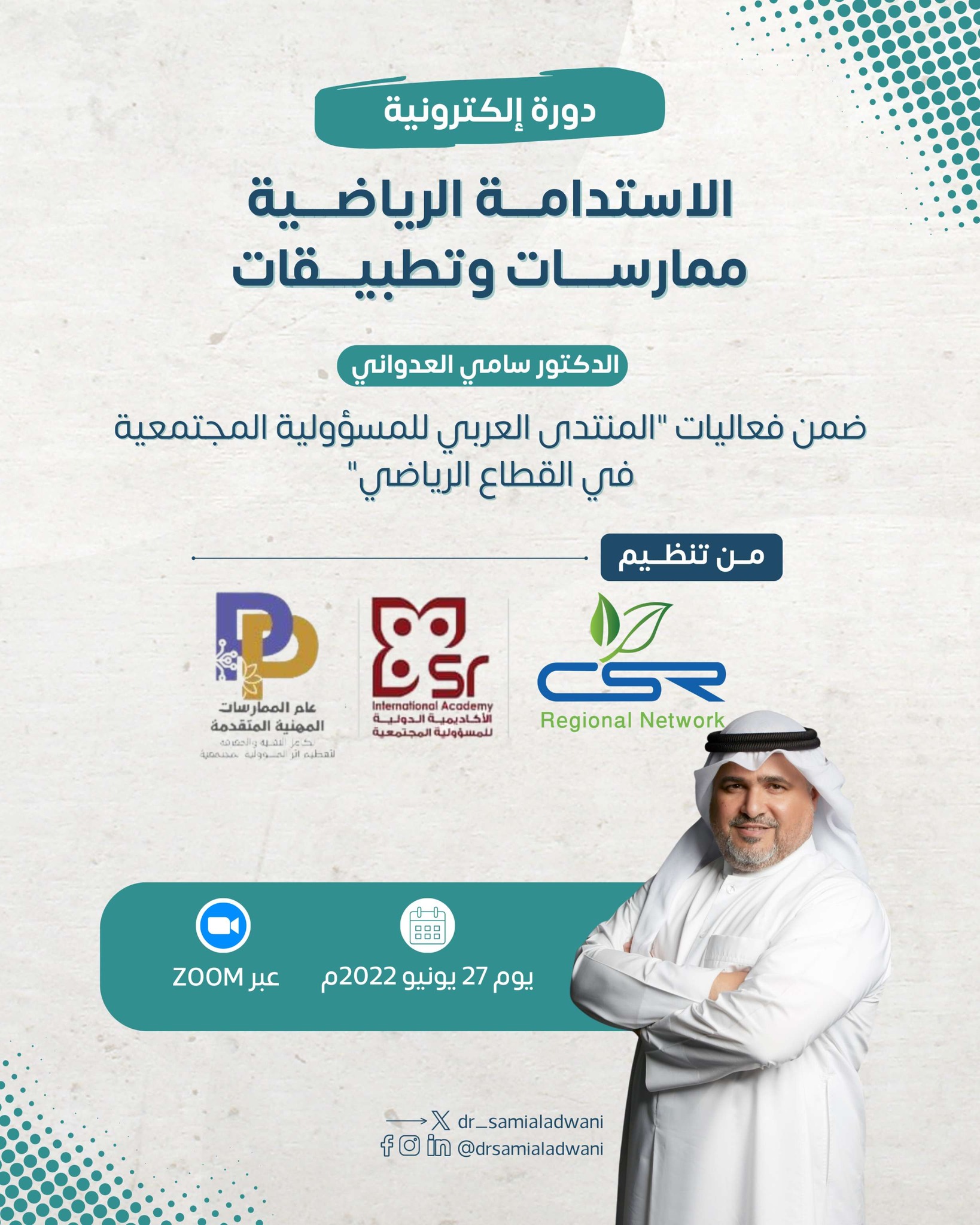 “الاستدامة الرياضية، ممارسات وتطبيقات” كان عنوان الدورة الإلكترونية التي تشرفت بتقديمها ضمن فعاليات “المنتدى العربي للمسؤولية المجتمعية في القطاع الرياضي” يوم 27 يونيو 2022.