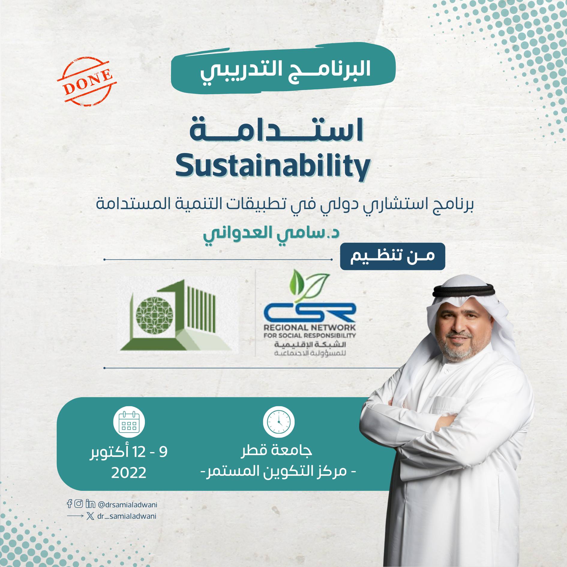 في 20 ساعة تدريبية مكثفة، اختتم بنجاح البرنامج الدولي “تدريب مدربين في مجال المسؤولية المجتمعية”، الذي قدّمه الدكتور سامي العدواني، بتنظيم مركز خدمة المجتمع والتعليم المستمر بقطر، وبالشراكة مع الشبكة الإقليمية للمسؤولية الاجتماعية.